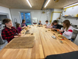 Nach dem obligatorischen Händewaschen machten sich unsere kleinen Bäckerinnen und Bäcker sogleich mit Nudelholz und Ausstechförmchen an die Arbeit. Während des zweistündigen Workshops konnten alle Teilnehmer nach Herzenslust an traditionelle Ausstecher fabrizieren. Anschließend wurden die Leckereien mit allerlei Zuckerstreuseln, Esspapier oder Glitzerperlen verziert.