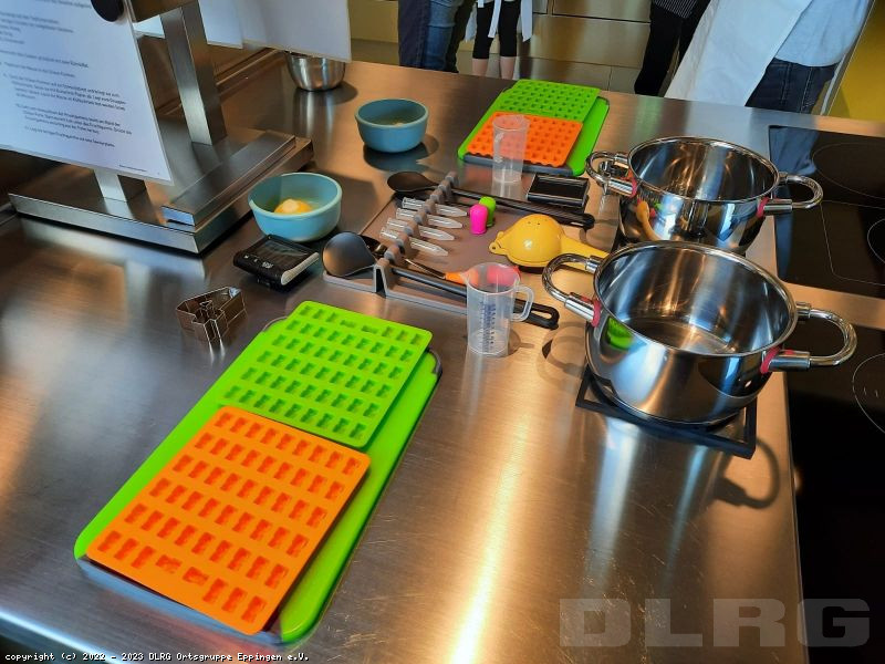 Nach einer Einweisung zu sicherem Arbeiten durch Frau Vögelein waren unsere Schwimmerinnen und Schwimmer für ihre eigene kleine Produktionsstätte verantwortlich und stellten nach Herzenslust klassische wie ausgefallene Gummibärchensorten her.